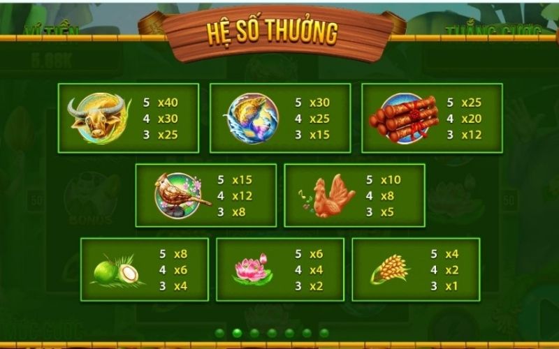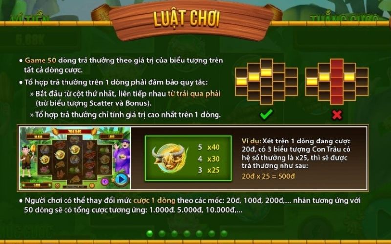 - Giả sử bạn quay được vào biểu tượng 5 Trâu Vàng thì phần thưởng cao nhất là x40. Vậy số tiền bạn nhận được sẽ là 20 x 40 = 800.